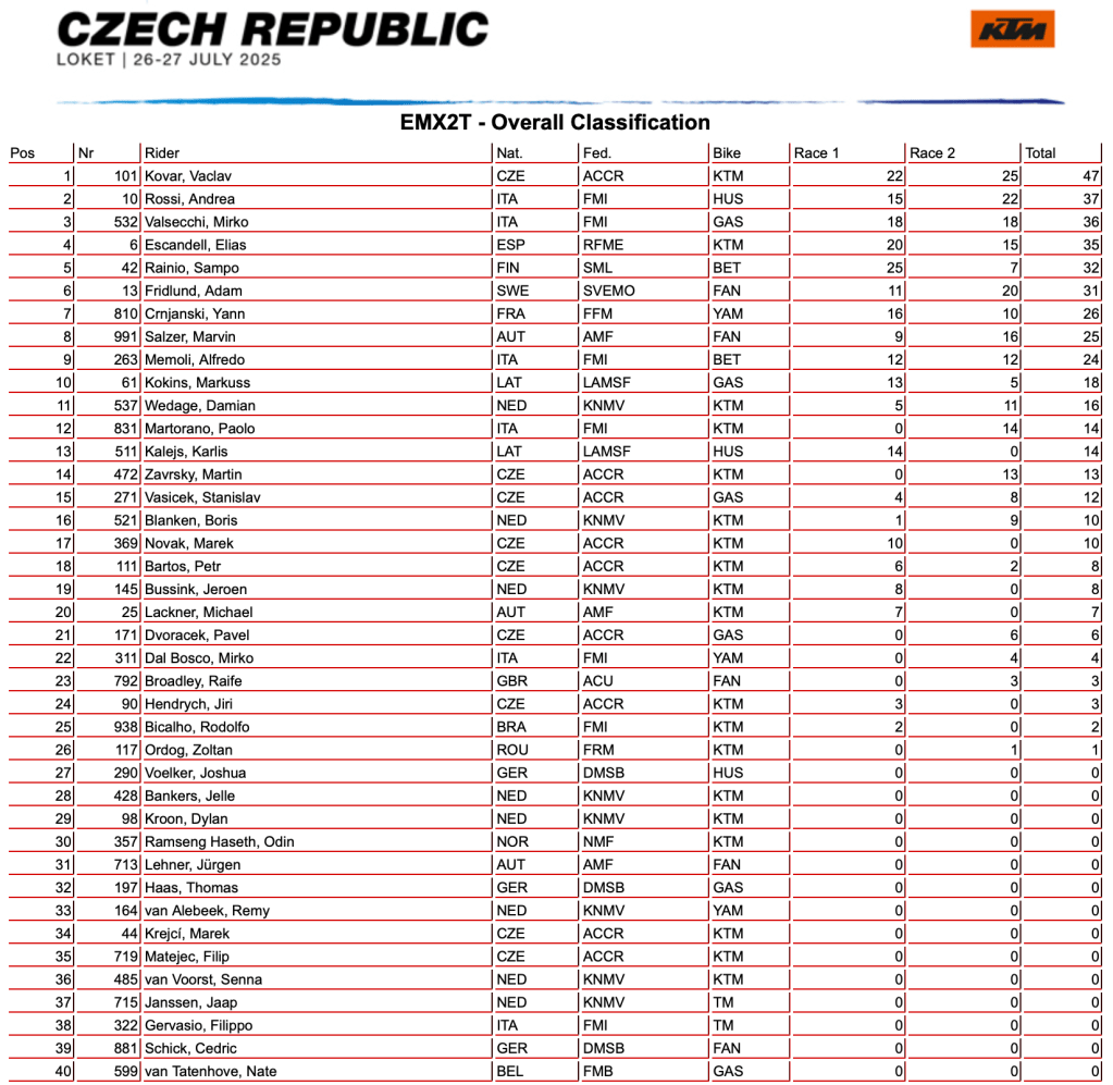 Vaclav Kovar put on an amazing display in front of his home crowd to secure the EMX2T championship! After finishing second in yesterday’s moto, the Czech native put on a clinical in today’s final moto, leading every lap on route to securing the overall victory ahead of Andrea Rossi and Adam Fridlund.