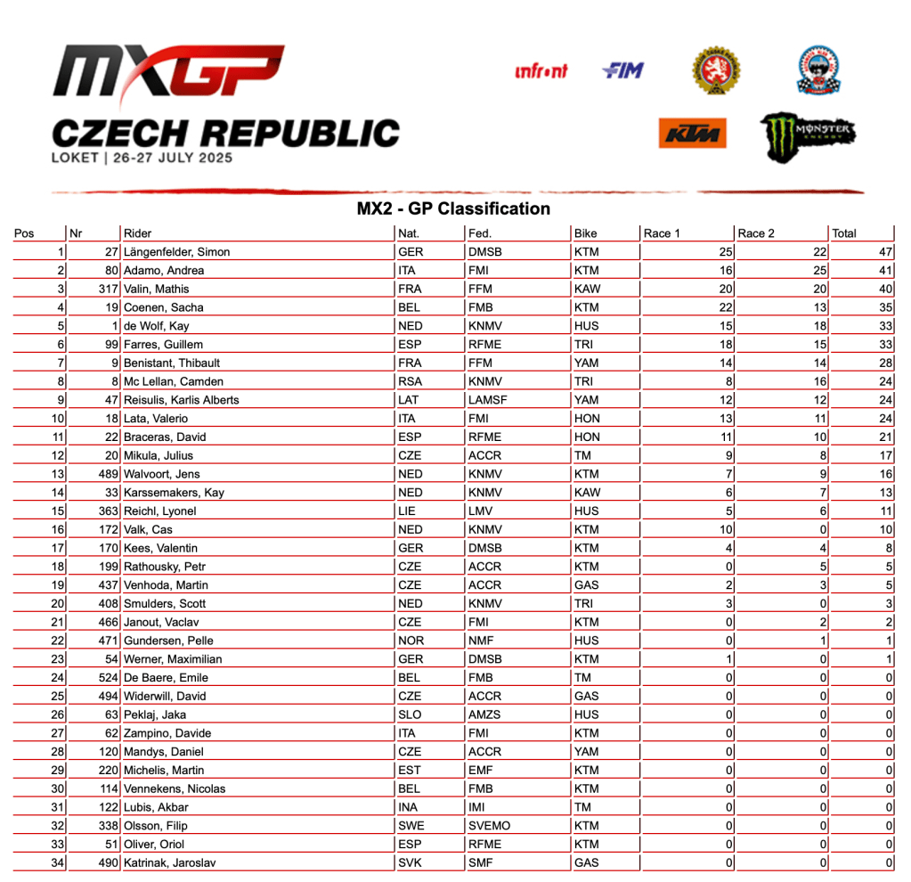 Championship leader Simon Längenfelder dominated MX2 Moto 1, with the Red Bull KTM Factory Racing De Carli rider pulling the holeshot and immediately checking out from the rest of the field. He eventually won by a margin of 16.5 seconds ahead of his teammate, Sacha Coenen.