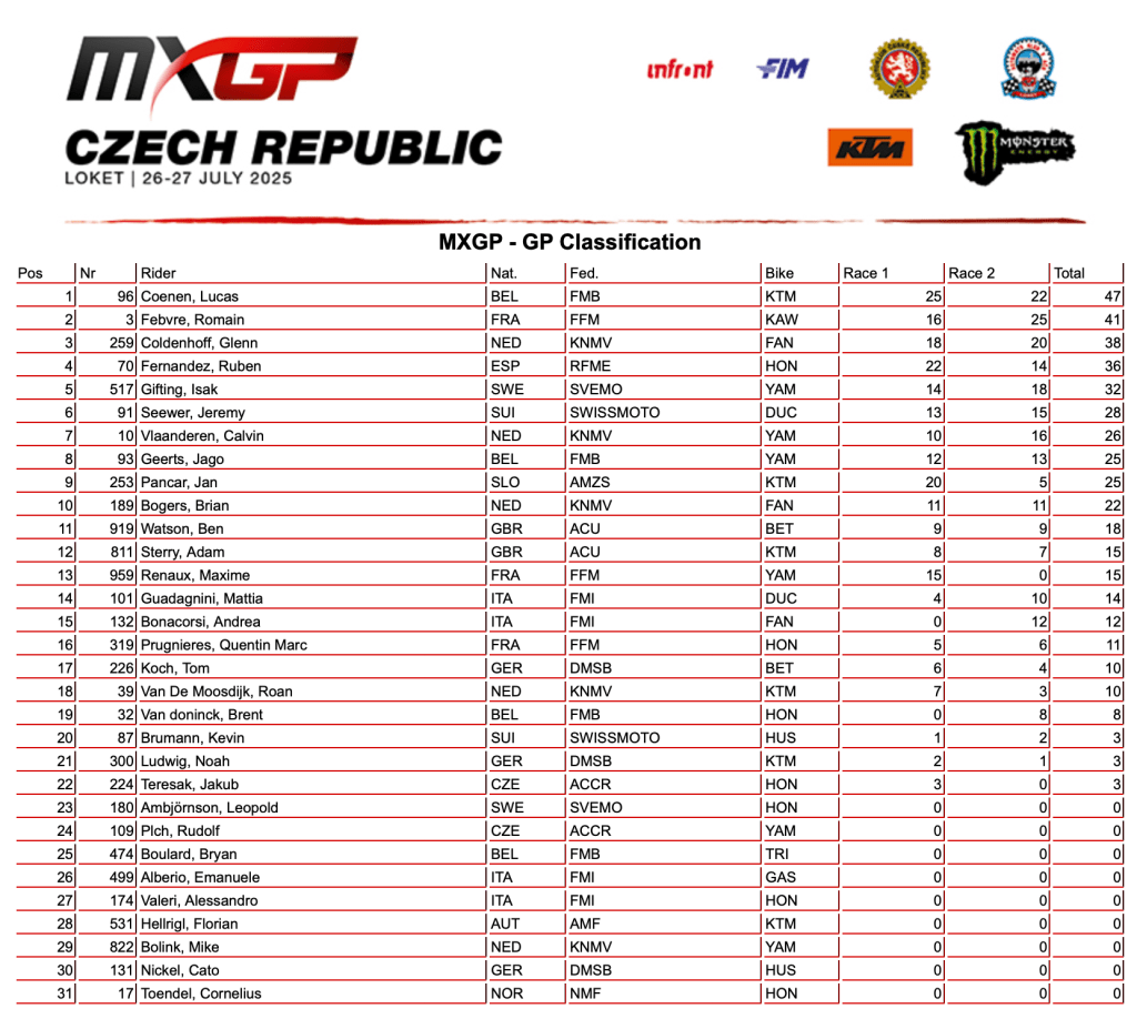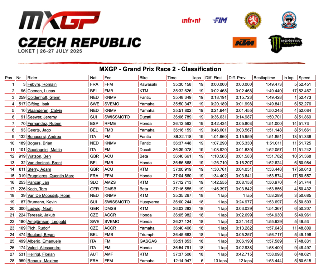 MXGP Moto 1 saw Red Bull KTM Factory Racing De Carli rider Lucas Coenen put on a clinic in front of the Czech crowd. The young Belgian pulled the holeshot and built a 20-second gap by the middle stages of the race. He eventually crossed the line with a 16-second advantage over Ruben Fernandez and Jan Pancar. Championship points leader Romain Febvre crashed on the final lap while running second, dropping him to fifth and allowing Coenen to close the gap in the standings to just seven points heading into Moto 2.