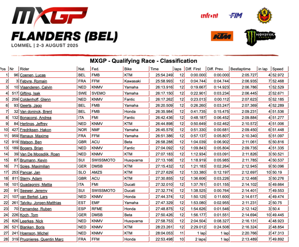Lucas Coenen gained one more championship point on points leader Romain Febvre as he eclipsed the Frenchman to take the MXGP qualifying win in the deep Lommel sand. The victory for the rookie marks the sixth time he has won a qualifying race in 2025.