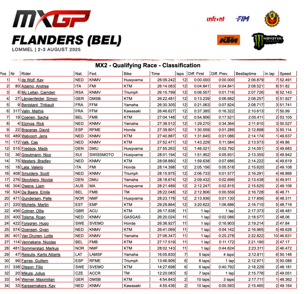Kay de Wolf clinched a much-needed win ahead of Andrea Adamo in the MX2 qualifying race. More importantly, both finished ahead of series points leader Simon Längenfelder, who placed fourth. Camden McLellan secured third place, a solid ride for the South African.