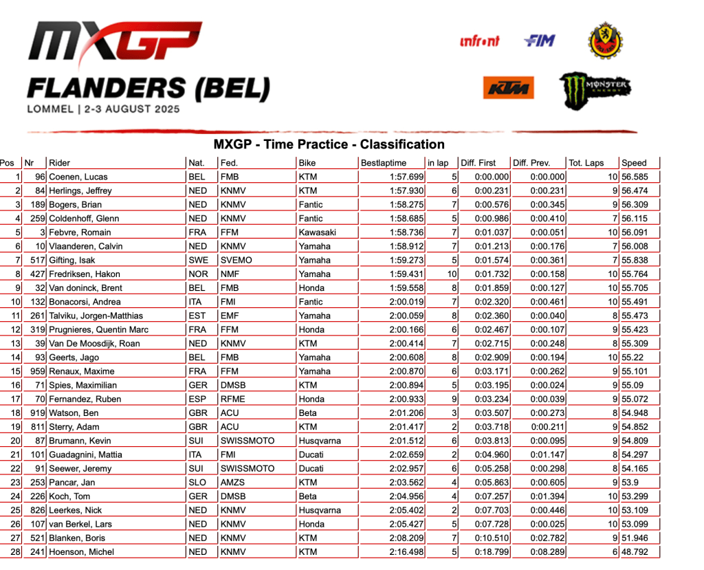Time practice is complete in Lommel and it was Kay De Wolf who was fastest in MX2 and Lucas Coenen claimed the quickest lap in the MXGP class.