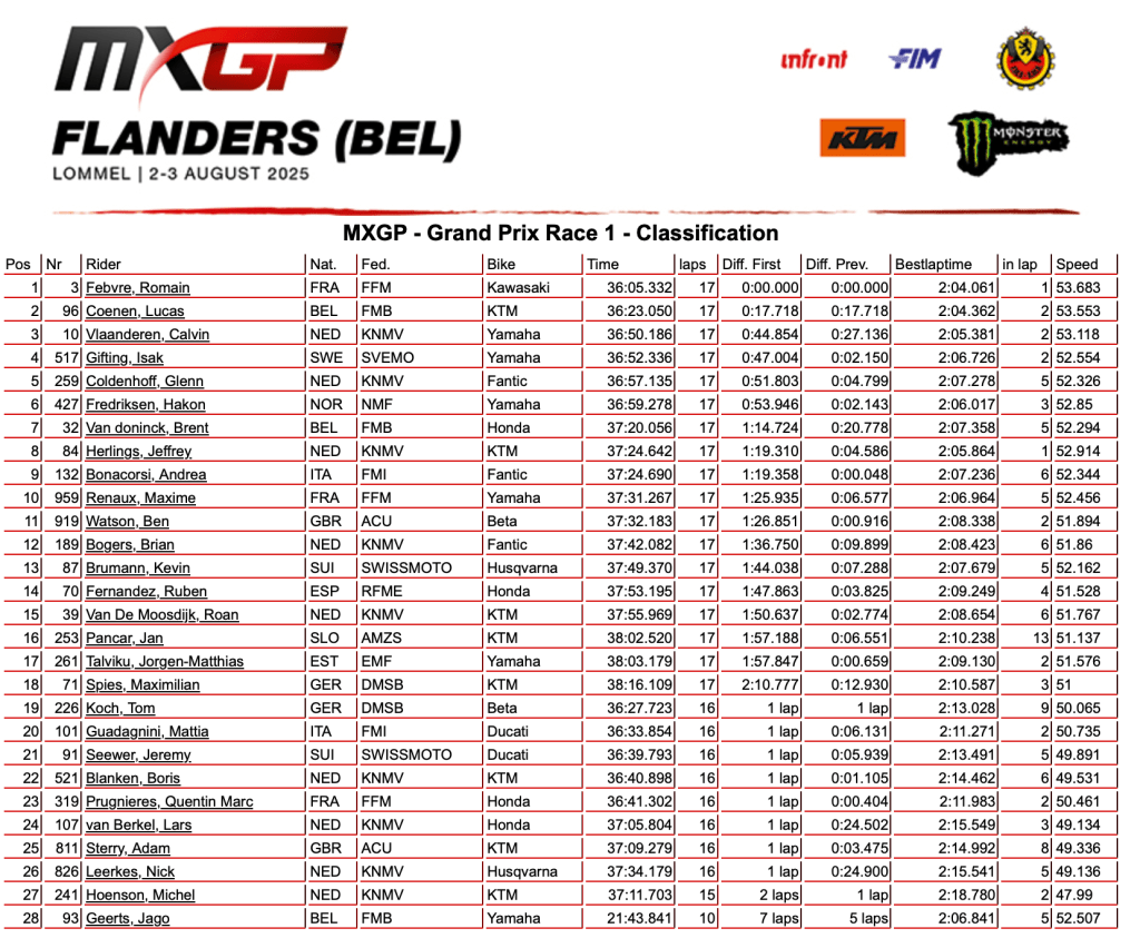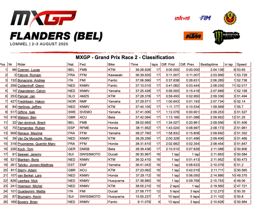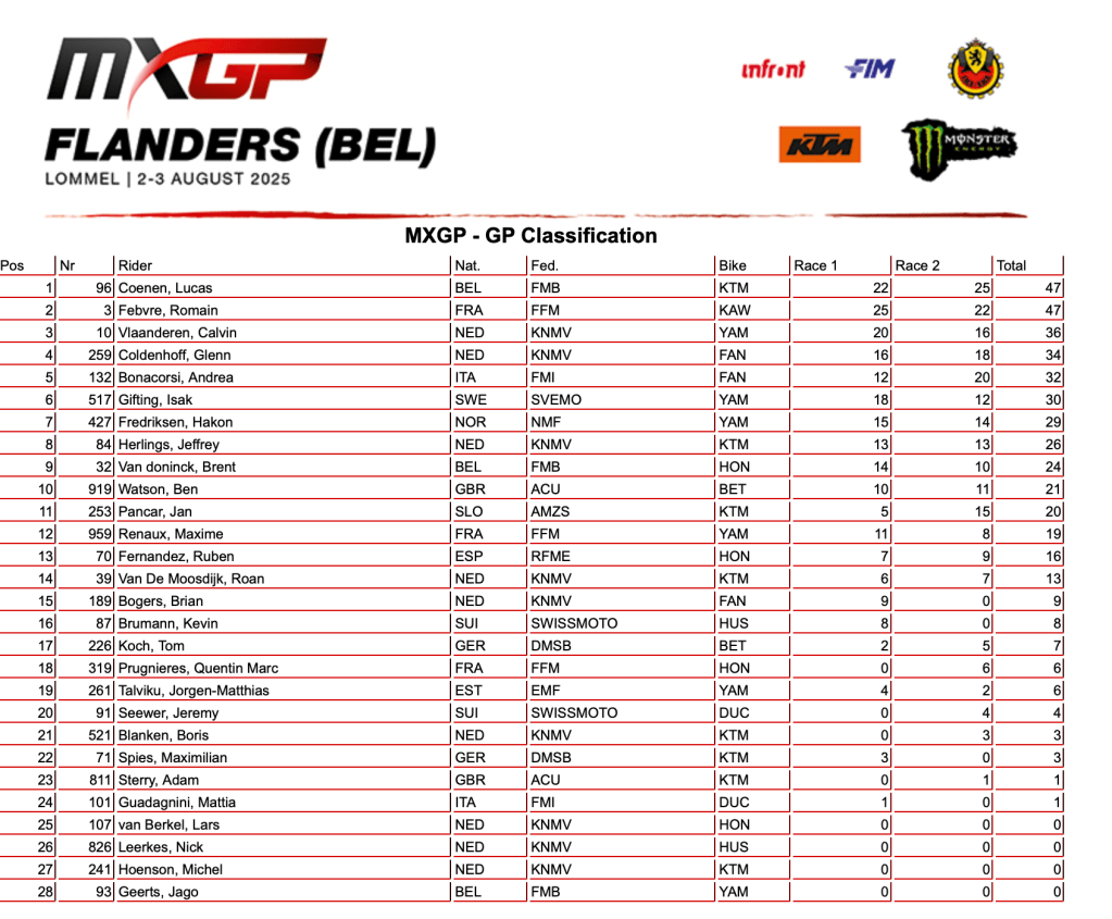 Jeffrey Herlings grabbed the holeshot and built an eight‑second lead within the opening three laps over Romain Febvre and Lucas Coenen, until a crash allowed both riders to pass. Coenen then surprised the Frenchman with a pass of his own and began to open a gap between the two title rivals. He went on to claim the race win and the overall victory at his home Grand Prix – Febvre however surrendered just one point to the rookie over the weekend.
