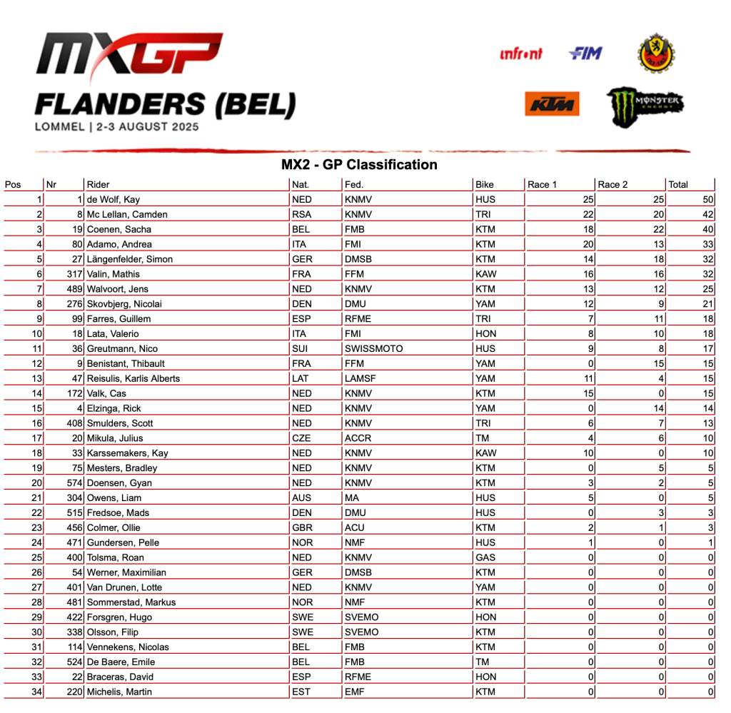 Kay de Wolf dominated proceedings in MX2 Moto 1, leading every lap en route to claiming vital championship points, while series points leader Simon Längenfelder could only manage seventh place. Camden McLellan finished an impressive second, with Andrea Adamo claiming third. Sacha Coenen once again showed incredible speed, but multiple crashes prevented him from keeping his bike upright, leaving the Belgian to finish fourth. He was also docked 5-championship points for not respecting waved yellow flags.