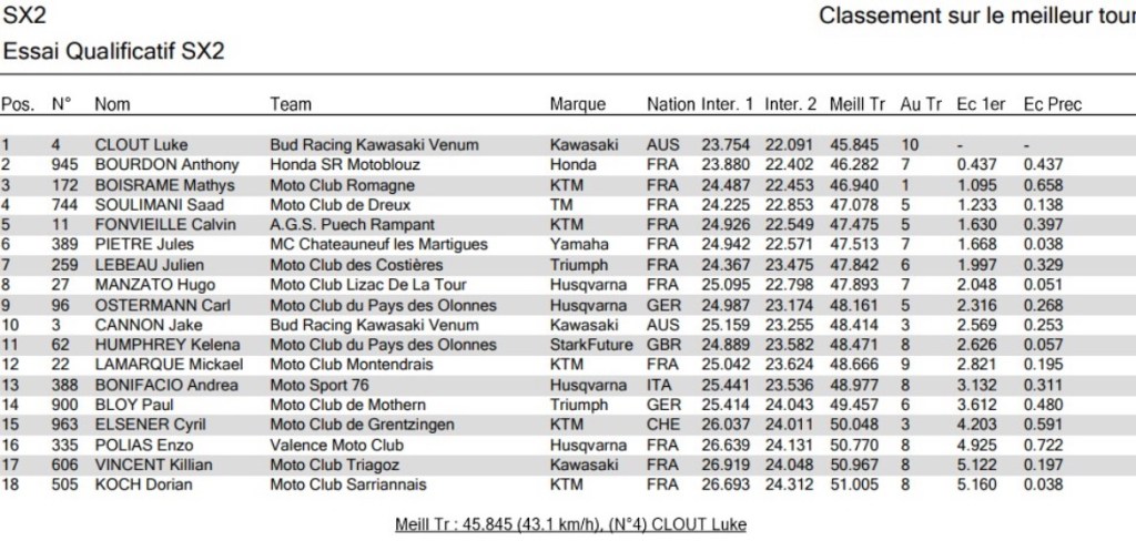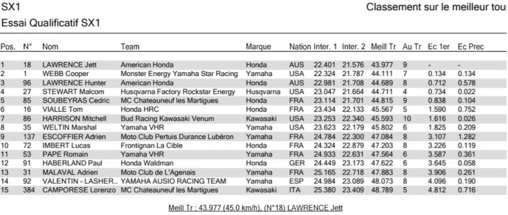 See below the qualifying results from day 1 in Paris! Jett Lawrence and Cooper Webb set the pace early in SX1…