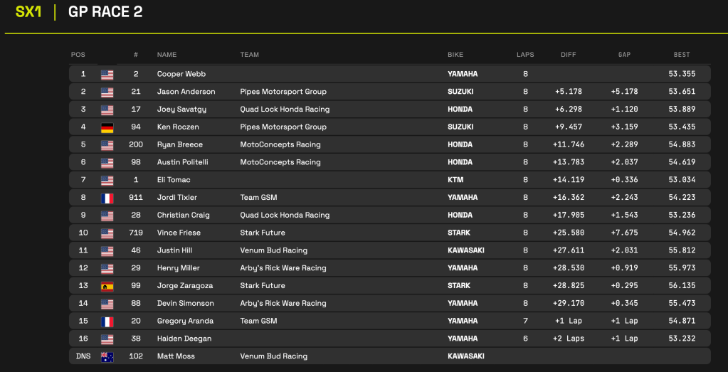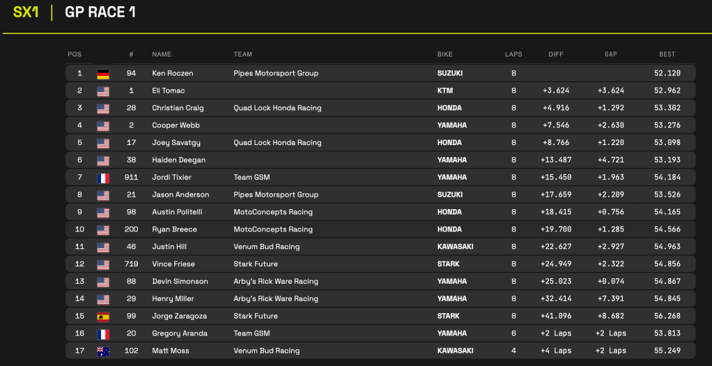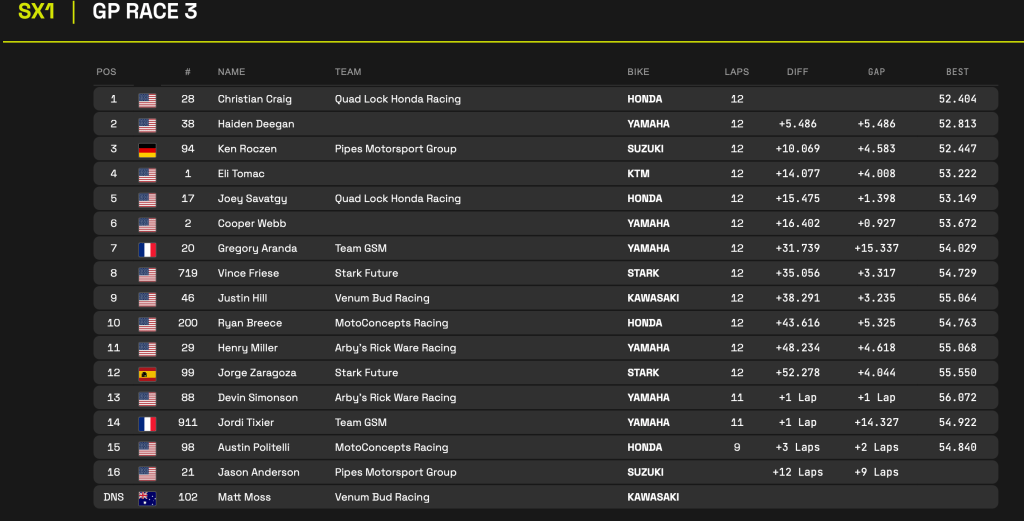 Ken Roczen claimed the overall win at the Australian GP with a strong opening-moto victory and another late charge in the final race. Christian Craig delivered one of the standout rides of the night, taking control of moto three with a clean pass on Tomac and pulling away for an impressive win. Haiden Deegan showed good speed throughout the evening and battled up front in moto two before a small front-end washout dropped him down the order. Tomac, Deegan, Savatgy and Webb were all in the mix across the motos, but Roczen’s consistency proved enough to secure the SX1 overall.