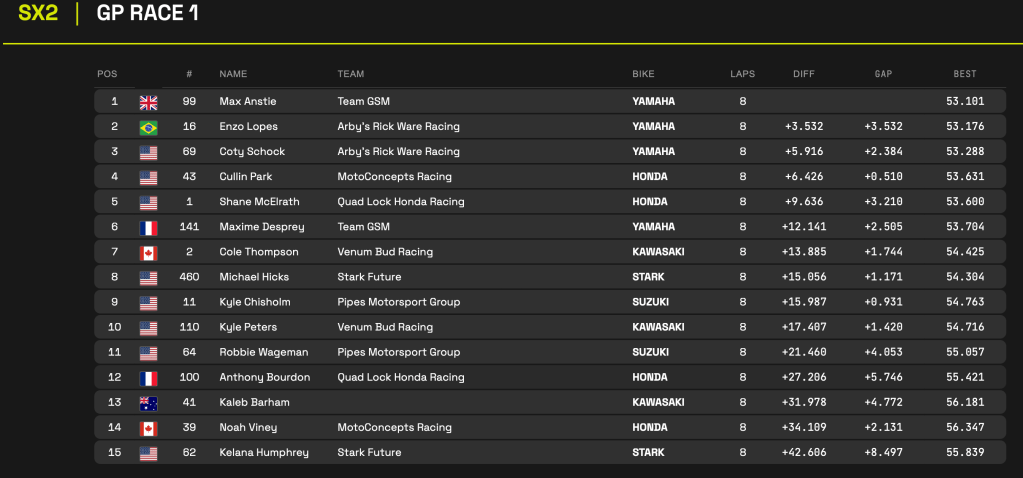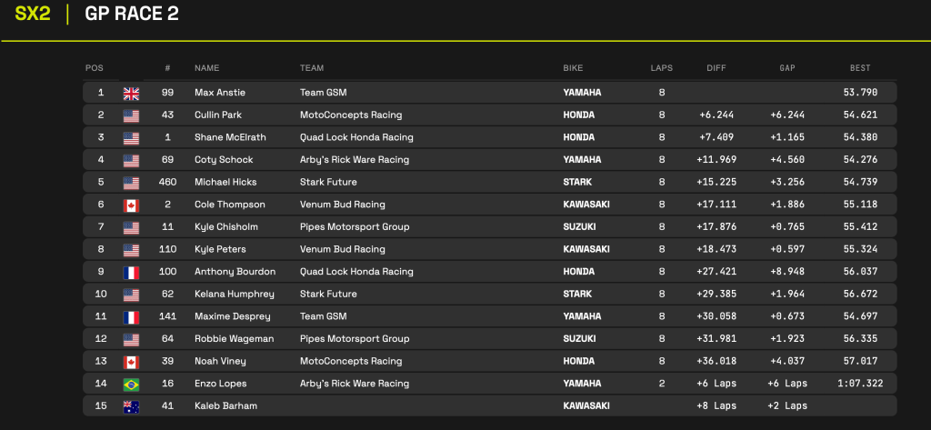 Max Anstie dominated the SX2 class in Australia, sweeping all three motos with ease. He passed Enzo Lopes early in race one, then capitalised on Lopes’ big crash in the whoops in moto two to take another comfortable win. In the final race, Anstie followed Shane McElrath for a few laps before making the move and pulling away again. Cullin Park and Coty Schock were consistently in the mix, but Anstie was on another level all night.