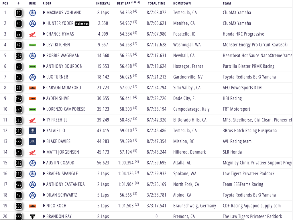 ClubMX duo Hunter Yoder and Maximus Vohland led the way after the pair rocketed out to an amazing start. Vohland made his way into the lead with around two minutes to go, with Honda HRC Progressive’s Chance Hymas positioned in third. The ClubMX pair secured first and second in the opening heat, logging impressive laps. Levi Kitchen got off to a poor start, battling his way into fourth from outside the top ten, posting the fastest lap time of the race (0:54.263). Wageman, Bourdon, Turner, Mumford and Shive rounded out the qualifying spots.