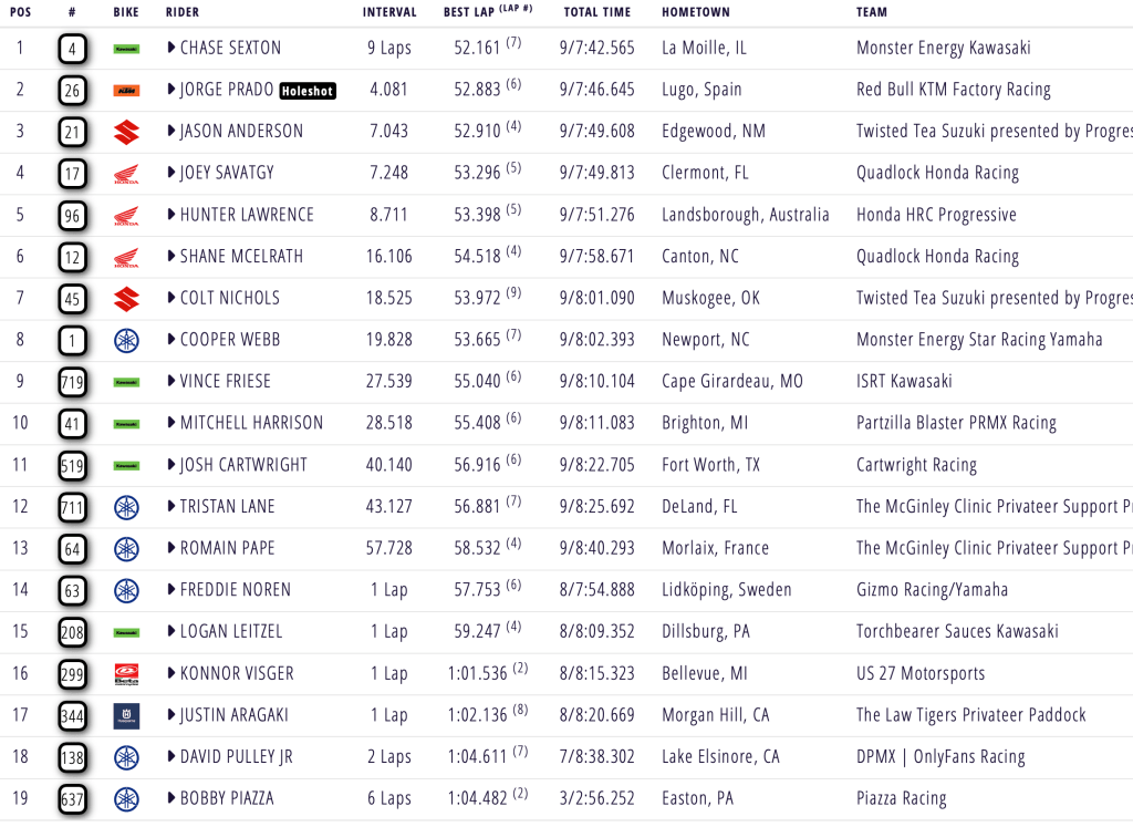 Jorge Prado pulled an incredible holeshot in front of Jason Anderson and Joey Savatgy, with Hunter Lawrence and Chase Sexton closest behind. Defending champion Cooper Webb fought his way into a transfer with only a handful of laps to go, and to be honest, I didn’t even notice the number 1 until the final laps. Sexton found another level, passing Anderson and Prado to take home the opening heat race victory. Prado finished second ahead of Anderson, Savatgy, Lawrence, McElrath, Nichols, Webb and Friese. A real impressive ride from Sexton, and to be honest, he needed it!