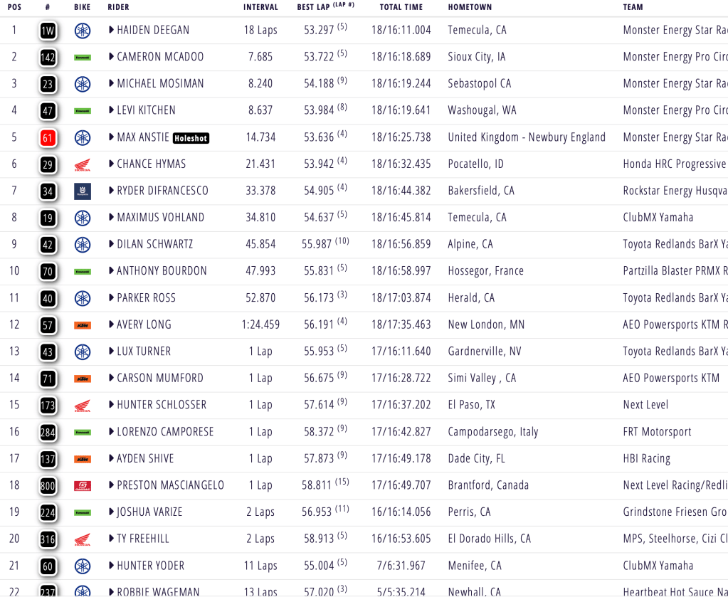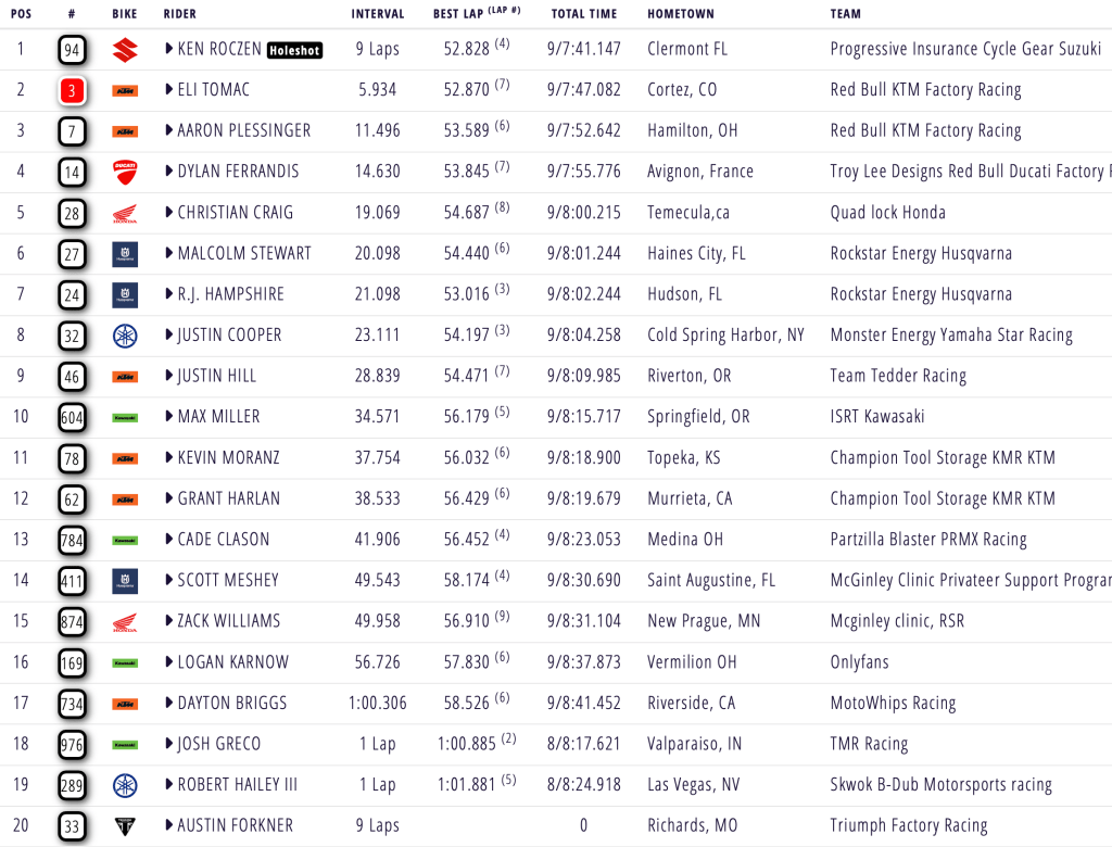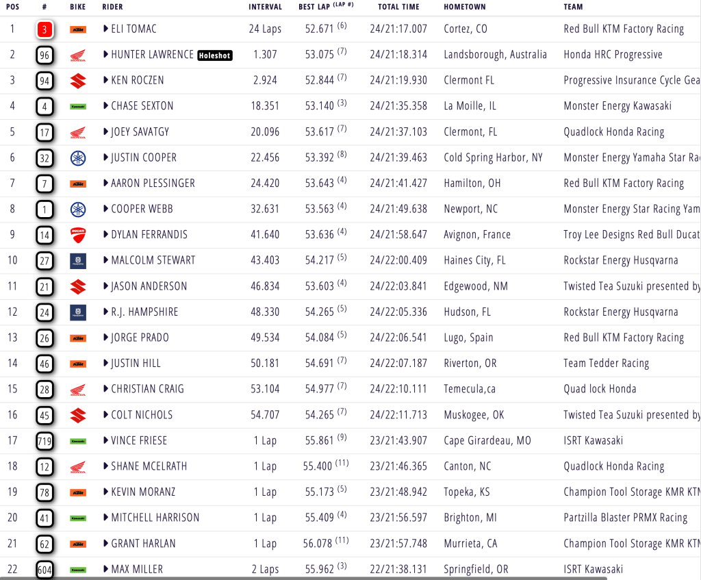 Ken Roczen rocketed out of the gate and began to piece together lightning laps to pull away from Hampshire, Plessinger and Tomac. Hampshire tucked the front, dropping back to ninth, while Tomac passed his teammate Plessinger on the same lap, but Roczen already held a five second advantage by the time ET3 was positioned behind him. Ferrandis worked his way into fourth aboard his Ducati with around two minutes remaining. Justin Hill made an impressive pass on Justin Cooper through the whoops, squaring the Star Racing rider up in the turn and making a great run through the long set, but Cooper reclaimed the position before the chequered flag. Roczen took a comfortable six second victory ahead of Tomac, Plessinger, Ferrandis, Craig, Stewart, Hampshire, Cooper and Hill.
