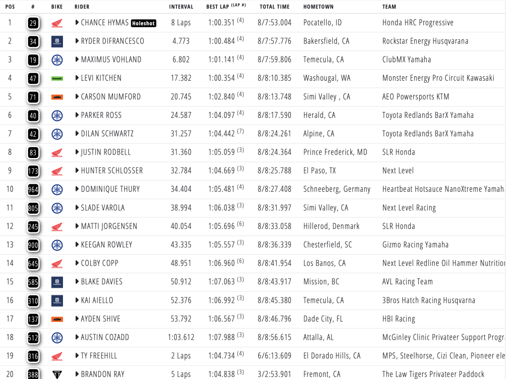 Honda HRC Progressive took home the win in the opening heat race of the evening, leading every lap after pulling the holeshot ahead of Monster Energy Pro Circuit’s Levi Kitchen. Kitchen had a huge crash tripling before the mechanics area, somehow managing to escape injury and finish in fourth. Ryder DiFrancesco finished second ahead of Maximus Vohland, with Carson Mumford securing fifth on his AEO Powersports KTM.