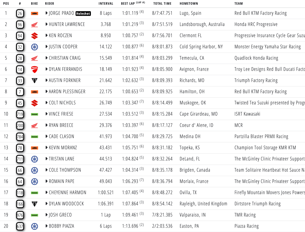 Red Bull KTM Factory Racing’s Jorge Prado pulled another holeshot and quickly had his teammate Aaron Plessinger chasing him down as he got around Hunter Lawrence. Ken Roczen charged into fourth just over halfway through the race and began to apply pressure on Lawrence. Plessinger crashed viciously on the last-lap double before the finish line, somehow managing to remount and ride his extremely tweaked KTM machine home in eighth, whilst Jorge Prado secured his second heat race win of the season ahead of Lawrence, Roczen, Cooper and Craig rounding out the top five.