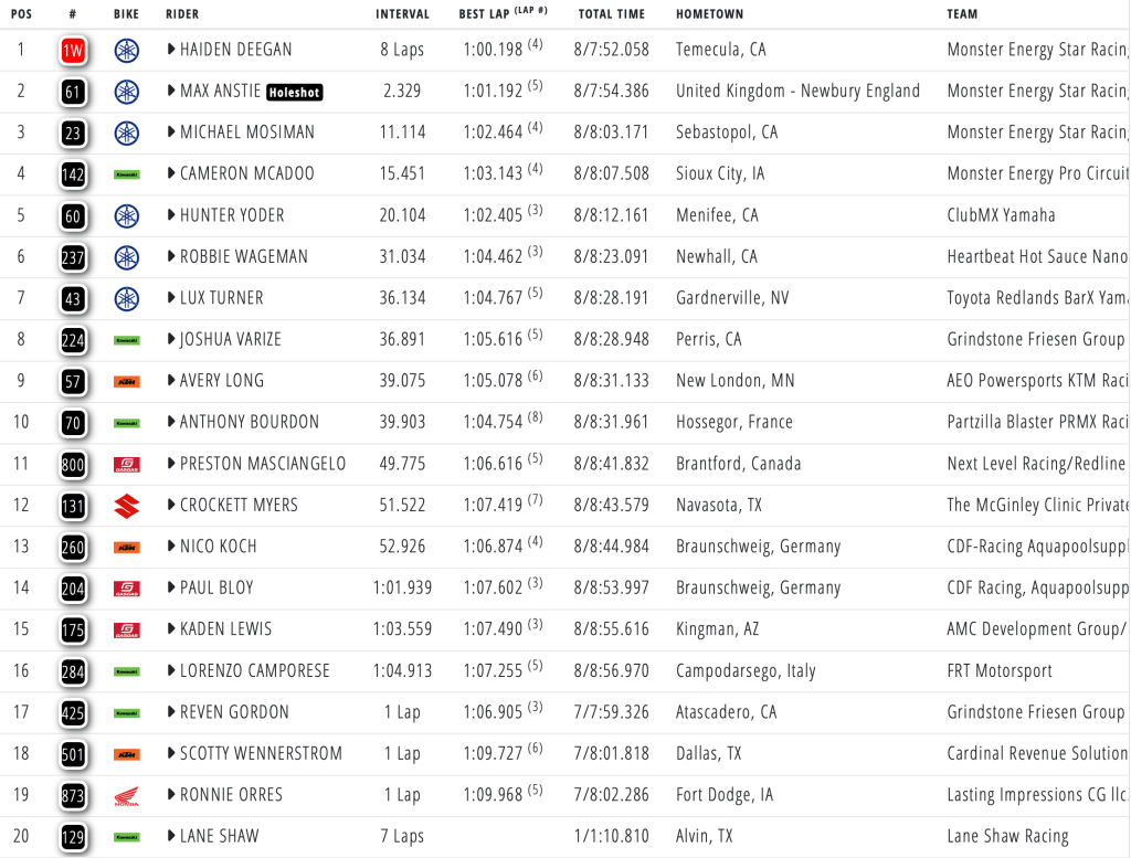 Cameron McAdoo pulled the holeshot but was quickly passed by the Star Racing trio of Max Anstie, Haiden Deegan and Michael Mosiman. Deegan tripled past his title rival around the outside after the finish line, and immediately tried to break away from Anstie. Deegan stretched his lead to a little over two seconds as he went on to score his third heat win of the season. Anstie finished second and Mosiman secured third, making it a Star Racing sweep.
