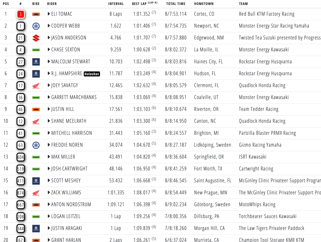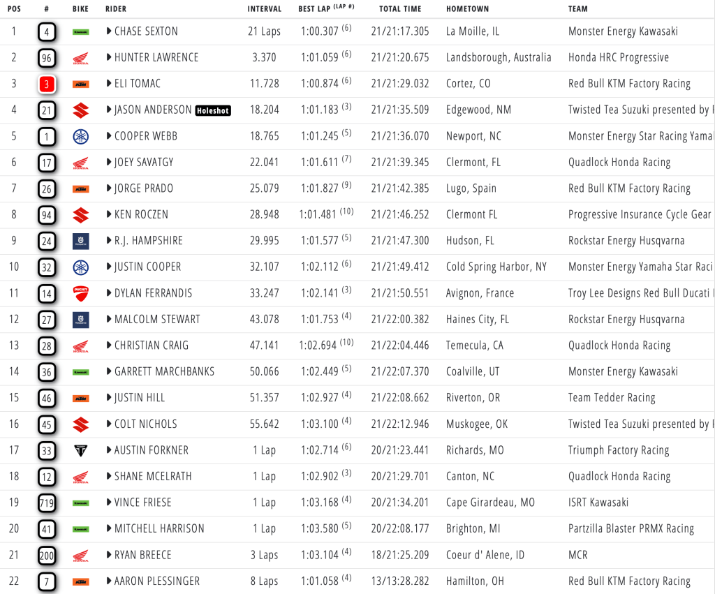 Rockstar Energy Husqvarna’s RJ Hampshire pulled the holeshot before defending champion Cooper Webb made his way past in the following turns. Fastest qualifier Chase Sexton quickly moved into the lead before tucking the front in the sand section, handing the lead back to Webb with Tomac on his tail. Tomac made his way past after the sand section and fended off attacks from the reigning champ. Jason Anderson rode his RM-Z450 home in third. Chase Sexton fought back from his early-race crash to finish fourth, with Malcolm Stewart rounding out the top five.
