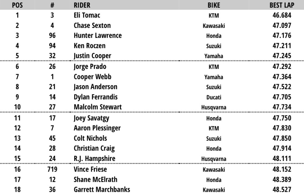 Just outside the top five, Jorge Prado clocked a 47.292 in sixth, ahead of Cooper Webb (47.364) and Jason Anderson (47.522). Dylan Ferrandis (47.705) and Malcolm Stewart (47.734)
