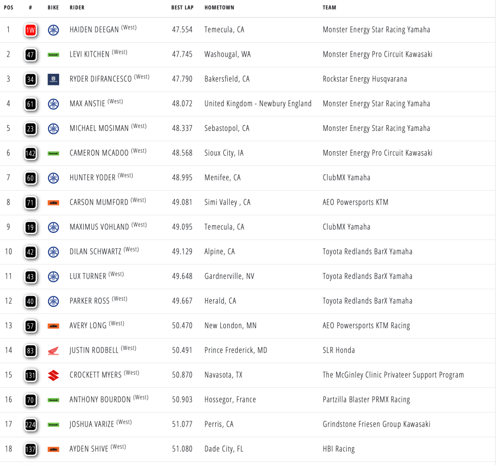Haiden Deegan topped qualifying in the 250SX West class after laying down a blistering 47.554, setting the benchmark for the session. Levi Kitchen was right there all the way through, stopping the clock at a 47.745 to secure second and keep the pressure on Deegan. Ryder DiFrancesco rounded out the top three with a solid 47.790, keeping himself firmly in the mix heading into the night show.
