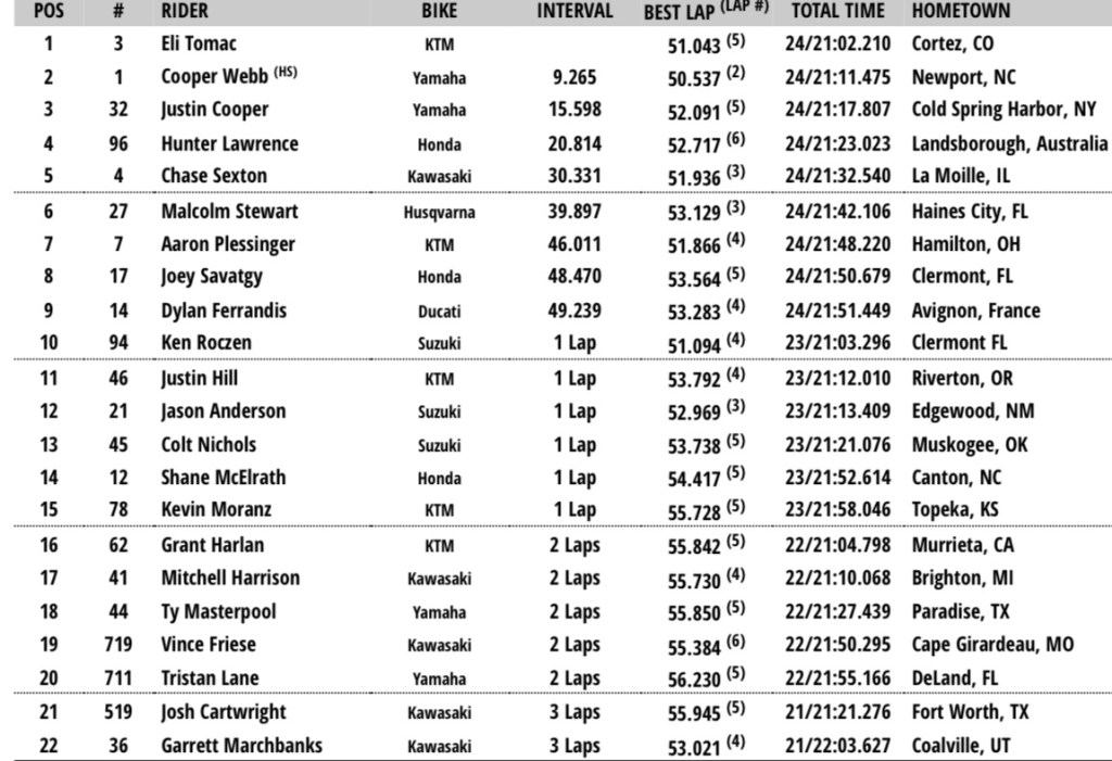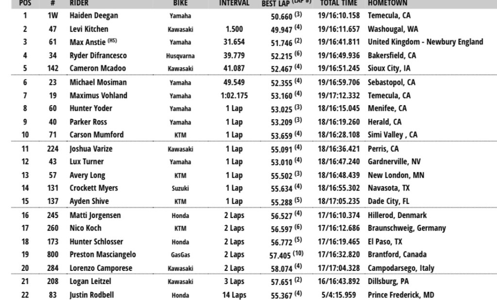 In the 250 West division, Haiden Deegan and Levi Kitchen put on a show for Kitchen’s hometown crowd! The pair exchanged position for the lead multiple times before Deegan eventually crossing the finish line to claim his 5th win of the season.